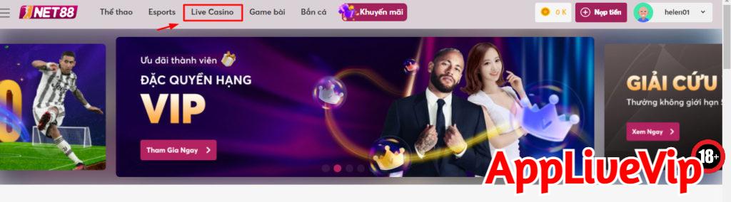 Sau khi đăng nhập tài khoản và nạp tiền thành công, trên thanh công cụ phía trên của màn hình nhấn chuột chọn “ Live casinos”